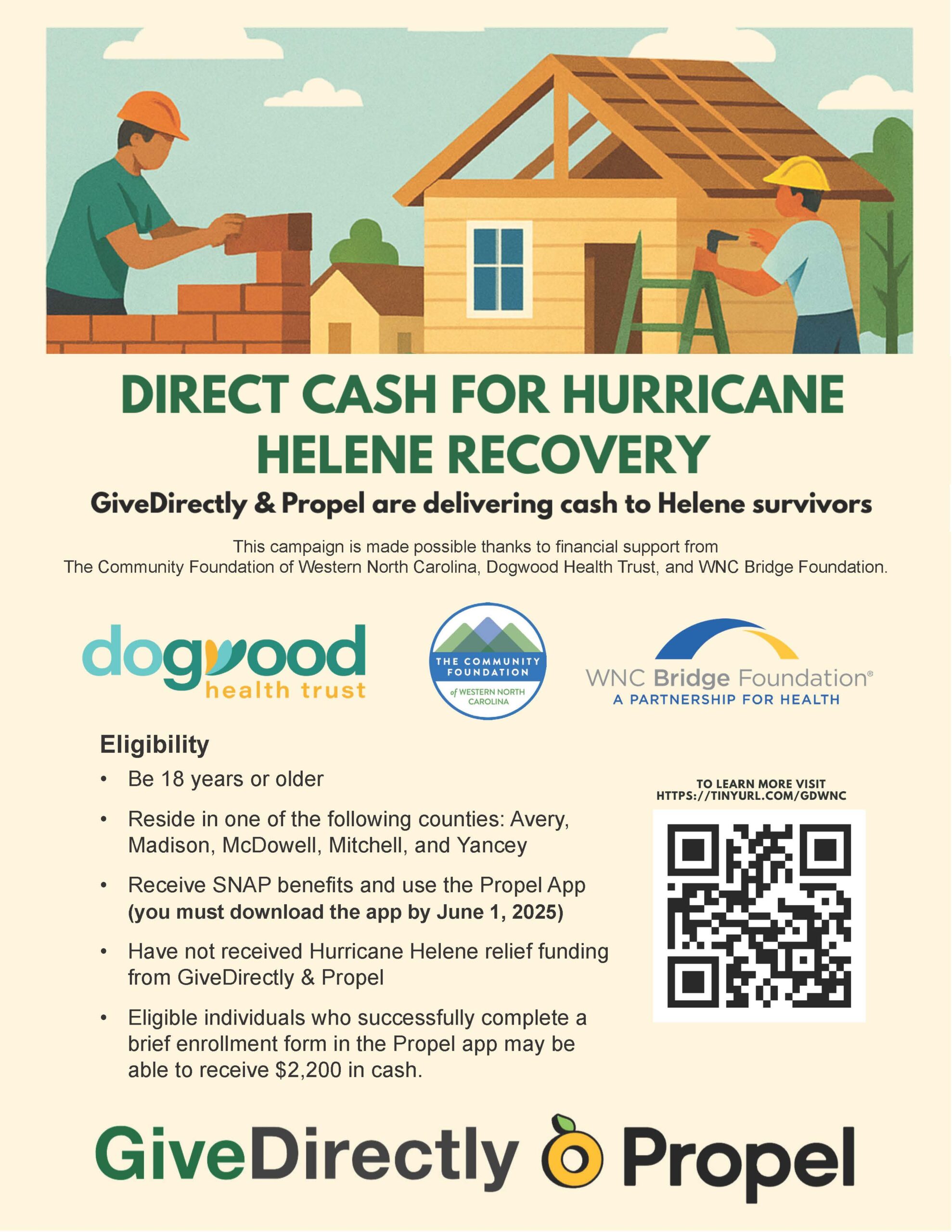 WNC Bridge is partnering with GiveDirectly and Propel to provide direct financial assistance to households in Avery, Madison, McDowell, Mitchell, and Yancey Counties to support Hurricane Helene recovery efforts.